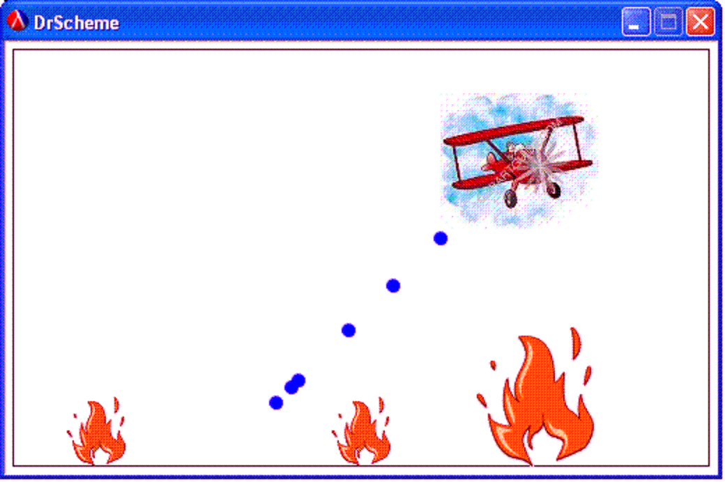 Your job is to write a simple interactive game in which the player drops water from a plane onto fires on the ground; the goal of the game is to put out all of the fires by dropping enough water on them. A sample appears to the right. The plane is always moving across the screen. The player can change the direction of the plane by pressing the left and right arrow keys. The player can also drop water from the plane by pressing the down arrow key. Each fire has an intensity: when a drop of water hits a fire, the intensity decreases. If a fire burns without water hitting it, its intensity increases. A fire is extinguished when its intensity reaches zero. You will build this game using the same world.ss teachpack. Work in the "Beginner with List Abbreviations" language level. | |