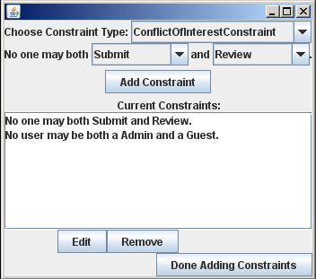 As more and more information is being made available globally through the Internet, it is becoming increasingly important to carefully control who has access to sensitive information. Such access rules are captured by access control policies, which are written by hand for each piece of information whose proliferation needs to be limited. Unfortunately, access control policies are deceptively difficult to write. Complicated rules can make any changes have unintended consequences. This issue is the driving force behind the Margrave Project, which helps policy authors identify unintended permissions or restrictions on a policy. This program is an initial implementation of a graphical assistant for access control policy authors. It attempts to help the author identify problems in the policy they create by requiring them to give information about the policy in two ways: first as a set of high-level constraints such as "No one may both submit and grade an assignment", and then as a set of access control decisions for each role, action pair defined. The system identifies the conflicts between these two representations, and guides the user through correcting them. ANSI/CEA-2018 Task Model: XML: