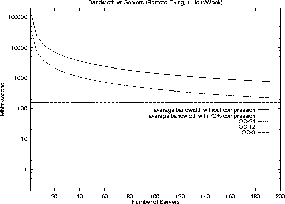 With compression and 75 servers, we can satisfy the user-level network bandwidth requirements for 200 simultaneous users.