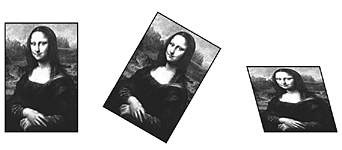 Here is one more example of how to work with Fourier transforms. The affine transformation is a class of geometric transformations that is useful in image processing. For example, these are the same image, but the second is rotated and the third is squashed and sheared.