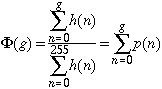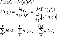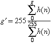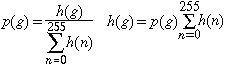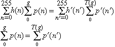 If we assume T(g) is continuous, the pixels with gray levels between g and dg in the original image map into a similar gray-level region in the final image: This equality results in two equivalent expressions relating the two histograms (before and after point transformation), one differential and one integral (summation):