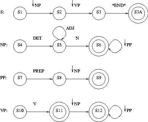 A sample ATN from class and its representation in list form (somewhat obscurely!) follow. Your input grammar does not need to use this syntax, it is merely included to be illustrative.