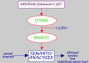 To generate the semantic analyer, first, we need to use jjtree to create the .jj file, Then we
